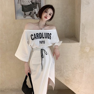 Set Áo Trễ Vai + Chân Váy Lưng Cao Xẻ Tà In Chữ Thời Trang Cho Nữ