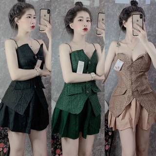 SÉT ÁO VEST KIỂU PHỐI NÚT KÈM CHÂN VÁY XẾP LY LỊCH THIÊ[P TINH TẾ H.H.P