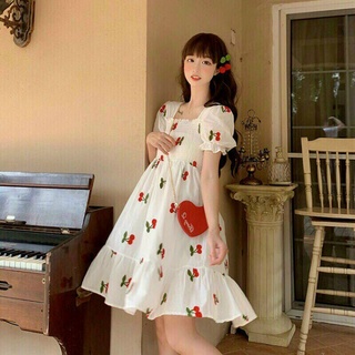 [ Miễn phí ship 2022 ] Đầm tiểu thư babydoll tay phồng,đầm trắng in cherry cổ vuông nhún ngực dáng xoè đi chơi dễ thương