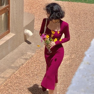 COZOK Đầm dệt kim tay dài cổ vuông phong cách vintage
