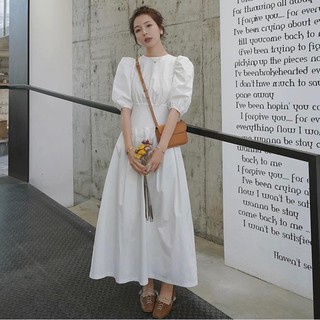 Đầm maxi trắng tay phồng bo eo thanh lịch