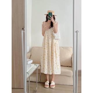 Váy Maxi Hoa Yếm 2 Dây Đính Hạt Dây Buộc Điều Chỉnh Đầm Hoa Dáng Dài Cài Hạt Gỗ Dáng Xòe Rộng Freesize