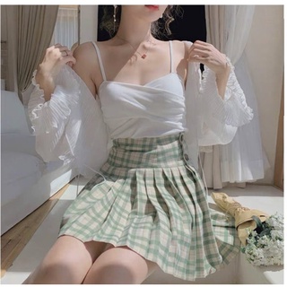 SET 3 MÓN : ÁO KHOÁC TAY LOE NƠ + ÁO 2 DÂY + CHÂN VÁY CARO