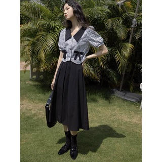 Set Áo Caro Phối Bèo + Chân Váy Chữ A Phong Cách Retro Cho Nữ