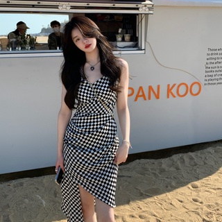 Đầm Hai Dây Họa Tiết Sọc Caro Phong Cách Retro Quyến Rũ Cho Nữ