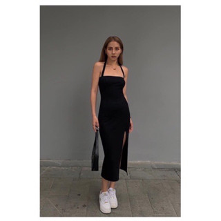Đầm, váy maxi cổ yếm đen xẻ hông siêu quyến rũ, sexy