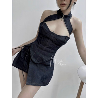 Sét đầm jean rời cổ yếm