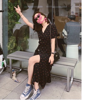 ĐẦM CỔ V ĐEN HOA HỒNG ĐỎ