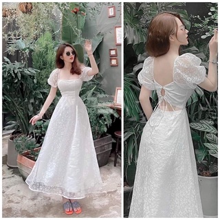 Đầm Midi Cổ Vuông Trắng Hoa Nổi Hở Lưng Dự Tiệc - D0602