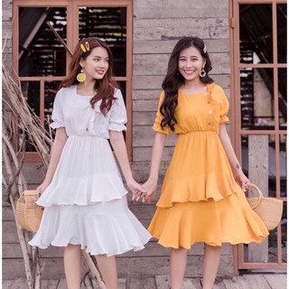 Đầm Trắng Xòe Midi Dáng Dài Cổ Vuông Nút Bọc (Hàng 2 Lớp), Đầm Trắng Dự Tiệc, Đầm Đi Đám Cưới - DX0141