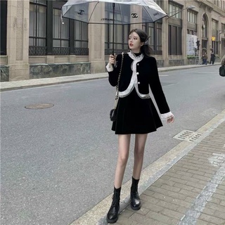 Váy nhung đen cổ somi trắng 735