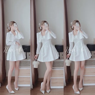 Sét 2 món áo khoác tay dài cổ sơ mi phối váy đầm nữ mini dáng xòe màu trắng dễ thương