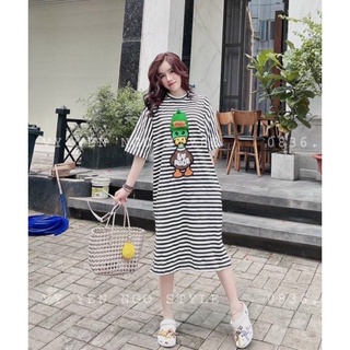 Váy Kẻ Tay Bèo Dáng Suông Dài Có Dây Buộc Eo Đầm Kẻ Sọc