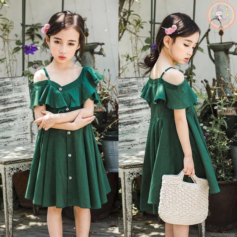 Đầm sát nách thiết kế trễ vai cho bé gái