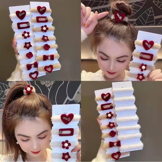 [Set 7 chiếc] dây buộc cột tóc co giãn phối lông nhung màu đỏ ngọt ngào ( #chun buộc tóc)
