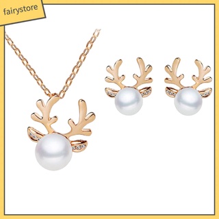 Bộ Dây Chuyền + Bông Tai Hình Sừng Hươu Đính Ngọc Trai Giả Cho Nữ