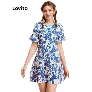 Lovito Đầm cổ tròn in hoa dễ thương L10E05 (xanh lam)