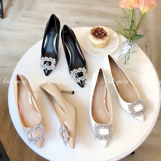 CG15 - Giày cưới, giày cô dâu ,Giày cao gót da bóng gót nhọn 7p nơ khoá vuông đá siêu xinh, lót mút siêu êm chắc chân