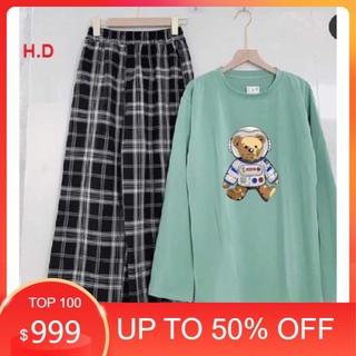 Set bộ áo thun in hình gấu chó + quần ống suông, set áo from rộng quần kẻ caro,bộ quần dài mặc đi chơi mặc nhà siêu xinh