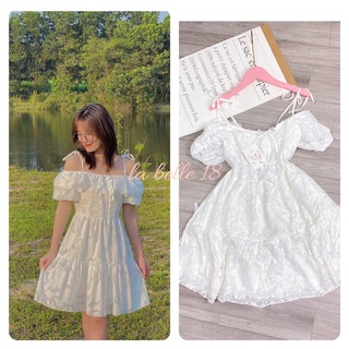 Váy Tiểu Thư Ren Trắng Bệt Vai Buộc Eo Dáng Xoè Tầng
