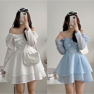 Váy voan dài tay đính nơ ngực 2 tầng bồng bềnh tiểu thư