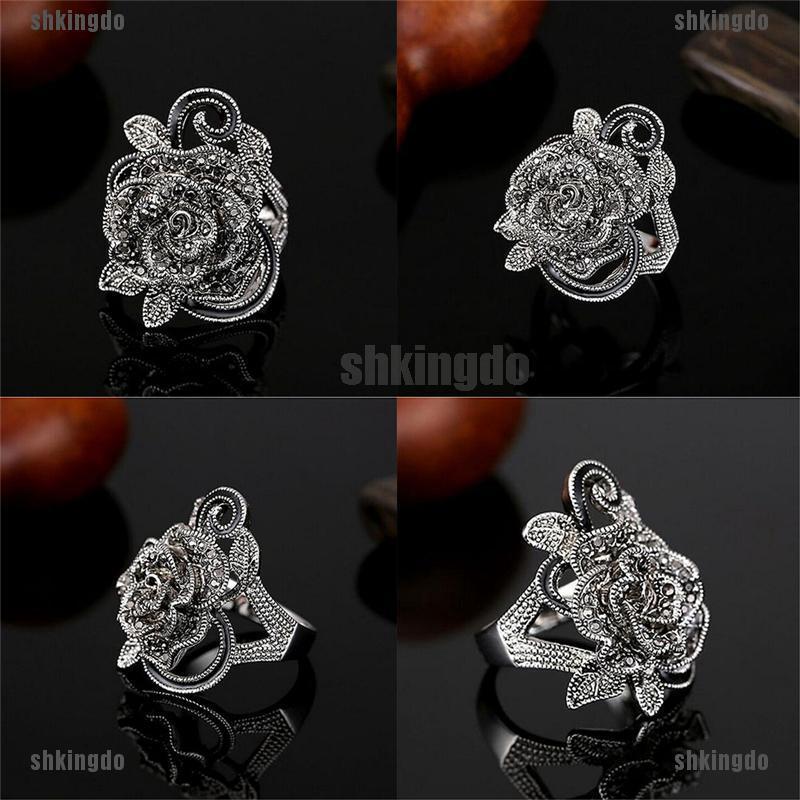 Nhẫn Hình Hoa Hồng Đen Đính Đá Phong Cách Retro