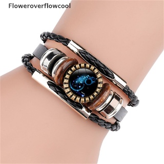 Vòng đeo tay dây da bện mặt thủy tinh hình 12 cung hoàng đạo phong cách punk cho nam