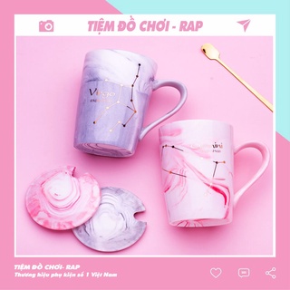 Ly cốc sứ hồng 12 cung hoàng đạo dung tích 450ml có nằp hoa văn vân đá tinh tế nhà Rap tặng kèm thìa cực đẹp - Ráp