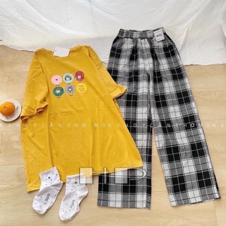 Đồ bộ nữ áo cotton in hình mix quần kẻ karo hot trend