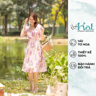 Đầm Tơ Hoa Cổ V Cột Nơ Eo The Kat House, chất vải mềm mịn, vải tơ siêu nhẹ, hoạ tiết hoa xinh xắn thanh lịch
