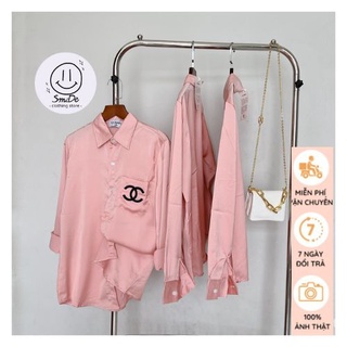 Áo Sơ Mi Lụa Bóng Thêu Chữ X Túi Ngực, Shirt Công Sở Channel Smide Clothing