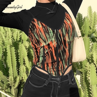 SweetyGirl Fashion Women Two Pieces Clothing Set Multicolor Printing Tank Top + Half High Collar Long Sleeves Crop Top