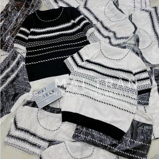 Áo len nữ, tay cộc phối viền trắng đen, len lỗ mongtoghi chữ thêu