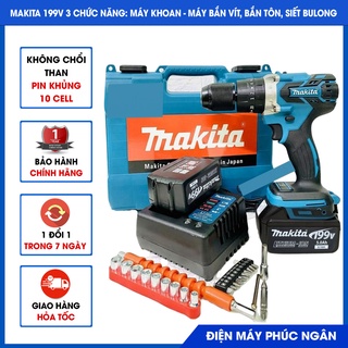 Máy khoan pin 199v, khoan pin Makita 3 chức năng, Máy bắn vít, khoan sắt, gỗ, tường. 100% lõi đồng, Tặng bộ 30 phụ kiện