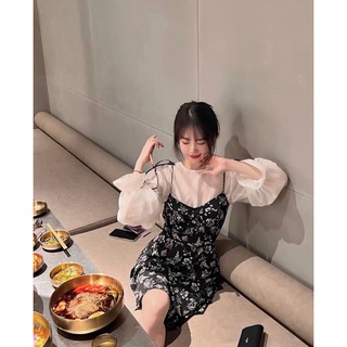 SET ĐẦM YẾM HOA ĐEN + ÁO TƠ TRẮNG TAY BỒNG