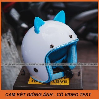 Nón 3/4 màu trắng lót xanh dương gắn tai mèo bằng nhựa xanh biển - mũ bảo hiểm tai mèo đi phượt