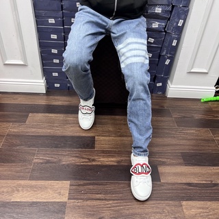 Quần JEAN THOM Xanh 4 Vạch Trắng Quần bò nam Thom 4 sọc Trơn Phối Dập Kẻ Trắng Đùi
