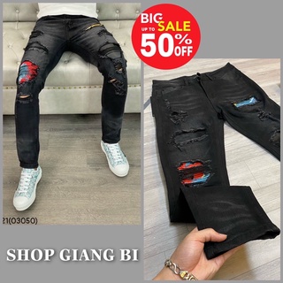 Quần jean amiri boy phố vá da nhăn đen wash rách tua vảy sơn,quần bò amiri vá da cứng 4cúc loang chân màu xanh ngà