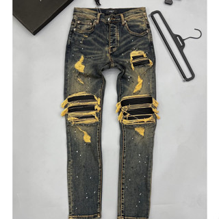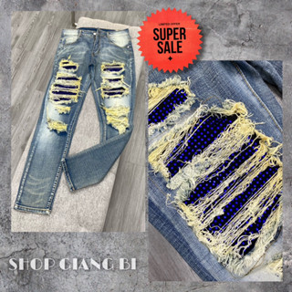 Quần jean bò nam Amiri slimfit xanh rách tua vàng vá da nhăn đen dọc đùi gối siêu rẻ đẹp QJ244P