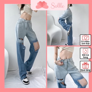 Quần jean nữ loang màu rách gối cá tính quần bò ống rộng cạp cao hack dáng Sollle QDJ005