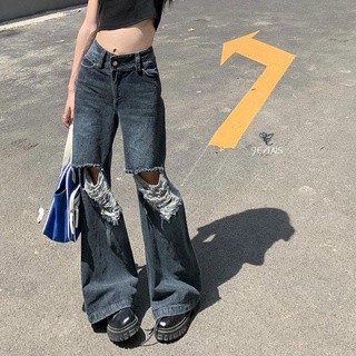 Quần Jean Nữ Cạp Cao Ống Rộng Rách Gối Thời Trang Đường Phố Mới