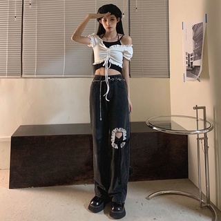 Quần Jean Dài Lưng Cao Ống Rộng Phối Rách Kiểu Retro Cá Tính Cho Nữ