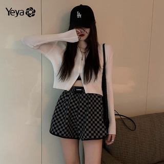 Quần short thể thao YEYA cạp cao ống rộng họa tiết caro cho nữ