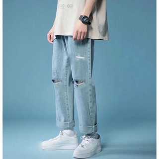 Quần Jeans Nam Baggy Xanh Rách Gối Ống Suông Rộng Dáng Đứng Phong Cách Hàn Quốc