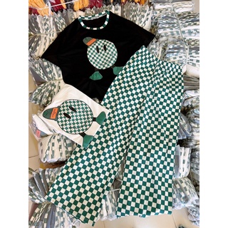 Sét áo phông Xanh in 3D hình dễ thương + quần kẻ karo, Áo thun from rộng, Chất đẹp không xù, quần suông ống rộng - MODY