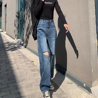 Quần Jean Nữ Ống Rộng Rách Gối Phong Cách Đường Phố Mới