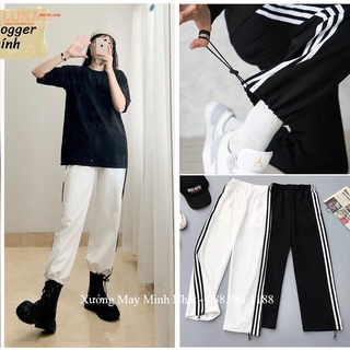 Quần thể thao ống rộng nữ viền kẻ 3 sọc trắng đi học ch có dây rút gấu dáng quần jogger nữ ống rộng tập thể dục vải mềm
