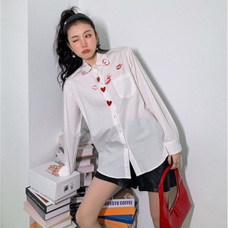 MUSHROOM LEE - Áo Sơ Mi Trắng Dấu Son Môi Nút Trái Tim