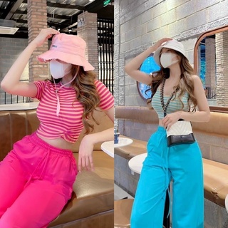 Xiaozhainv Set Áo Thun Ngắn Tay Form Rộng Họa Tiết Kẻ Sọc Và Quần Ống Rộng Lưng Cao Thời Trang Hàn Quốc