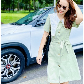 (SALE)Váy suông dáng bút chì màu xanh mint, cổ cách điệu, dây thắt luưng và 2 túi tiện lợi. Đầm tay ngắn có nút doc thân